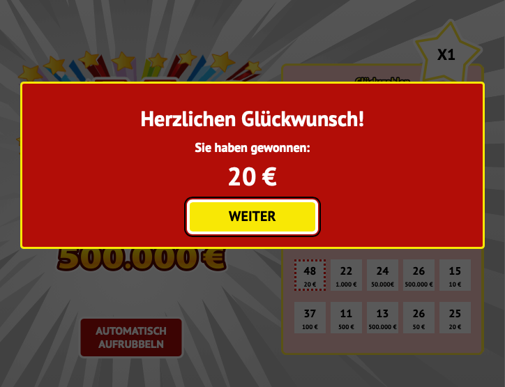 Rubbeln Sie das Feld mit den Glückszahlen (Kreuze) und die Gewinnzahlen-Felder (Sterne) frei. Stimmt eine der fünf Glückszahlen mit einer der 20 Gewinnzahlen überein, gewinnen Sie den darunter stehenden Betrag.